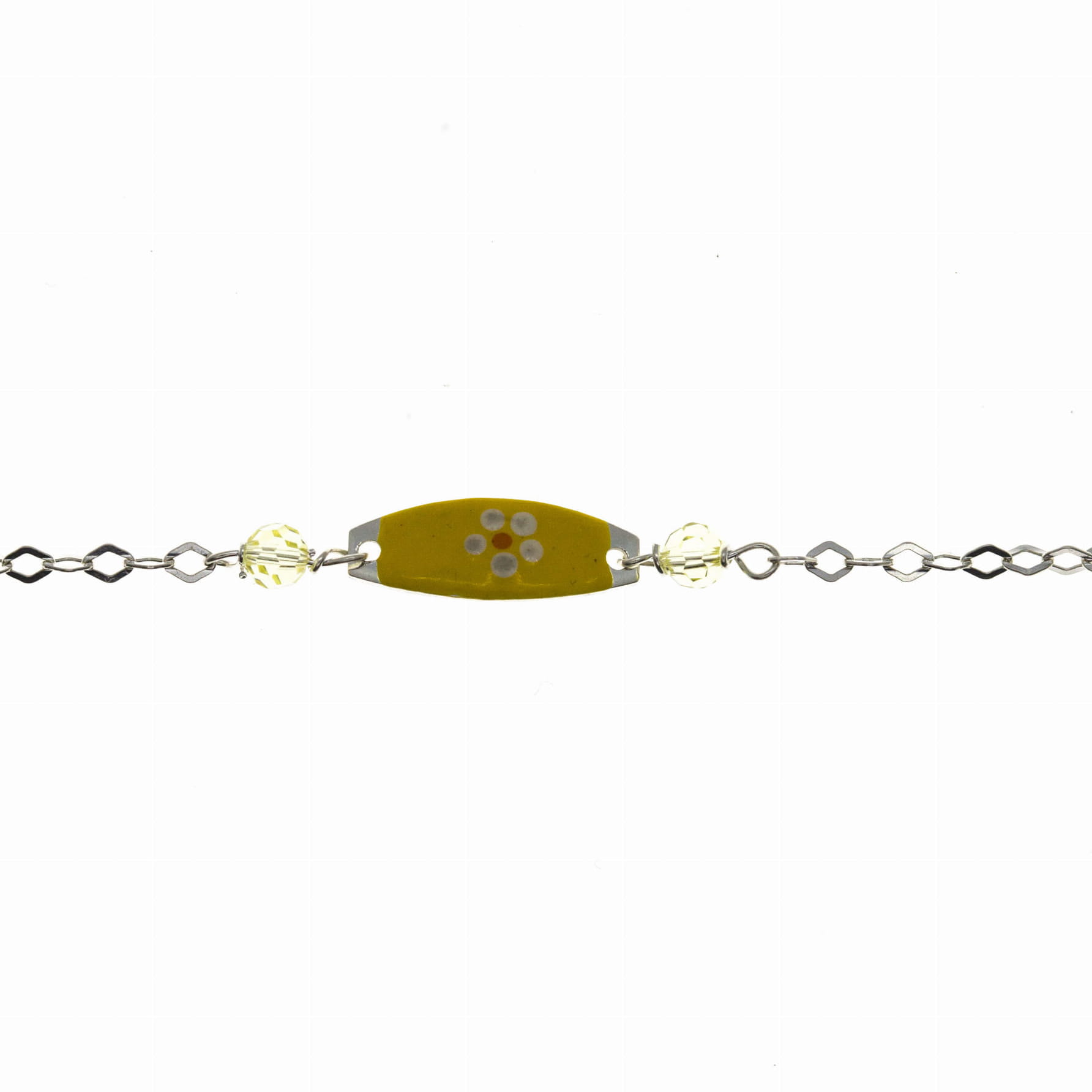 Bransoletka srebrna z blaszką z kwiatuszkiem i żółtymi koralikami.
