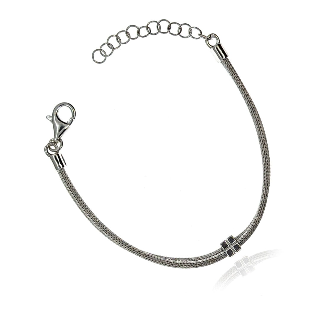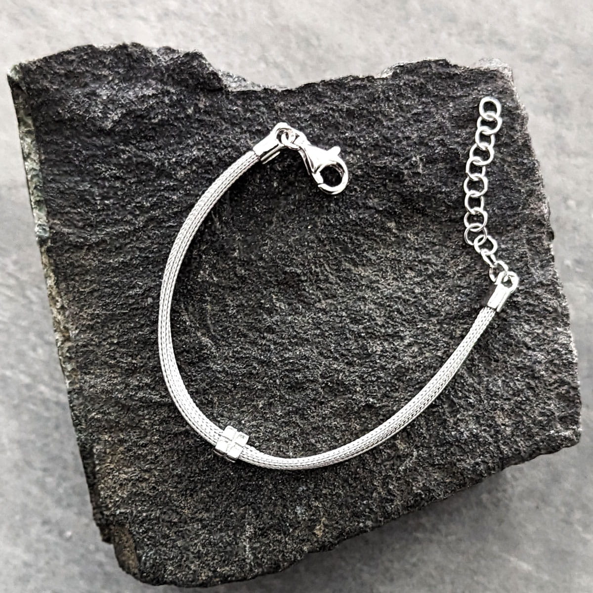 Bransoletka o splocie calza, srebrna – z kosteczkami.