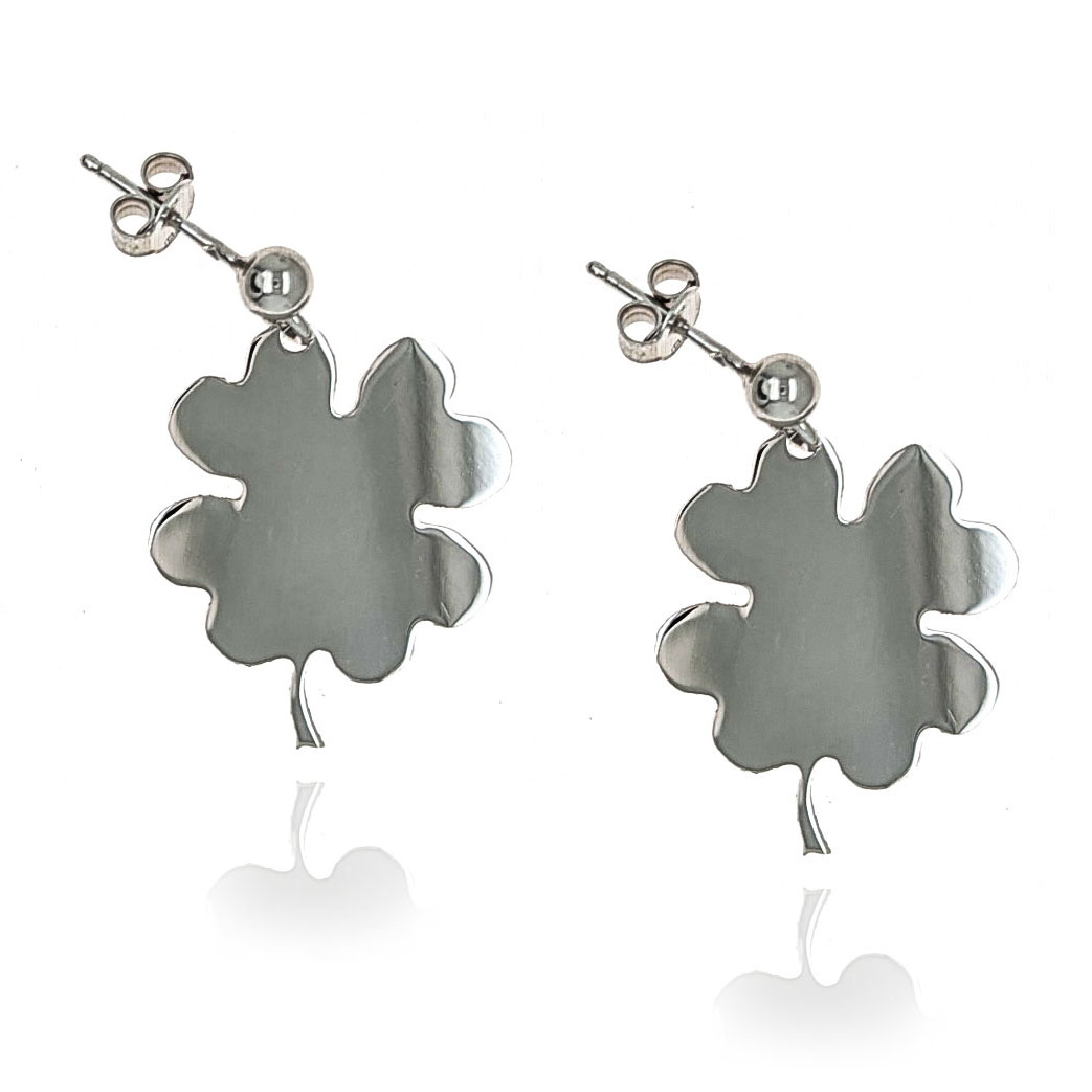 Kolczyki z zawieszką w kształcie koniczynki. Koniczynka to jeden z najpopularniejszych symboli szczęścia na świecie.