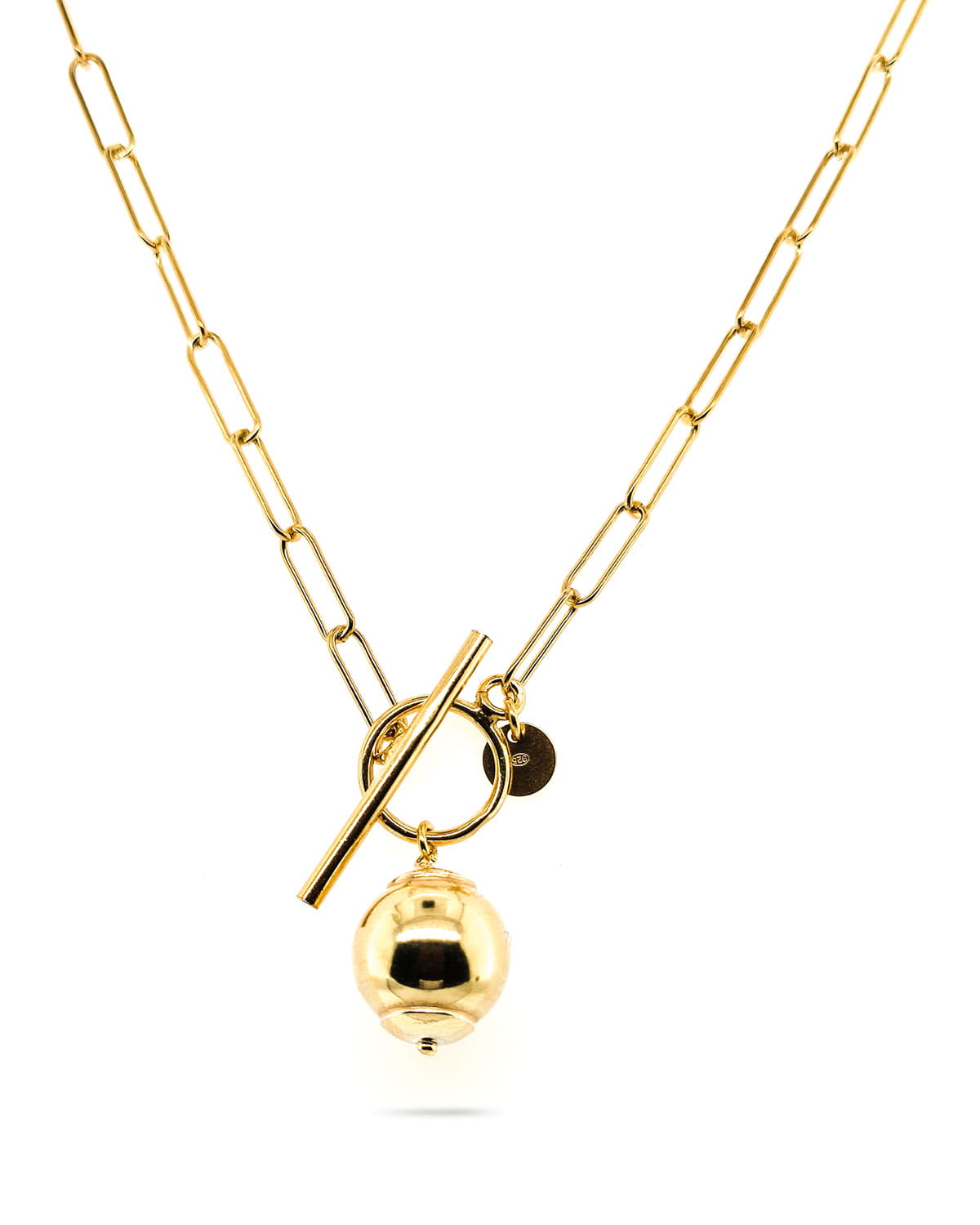 Naszyjnik srebrny, pozłacany z ogniw oraz z ozdobną, efektowną kulą.