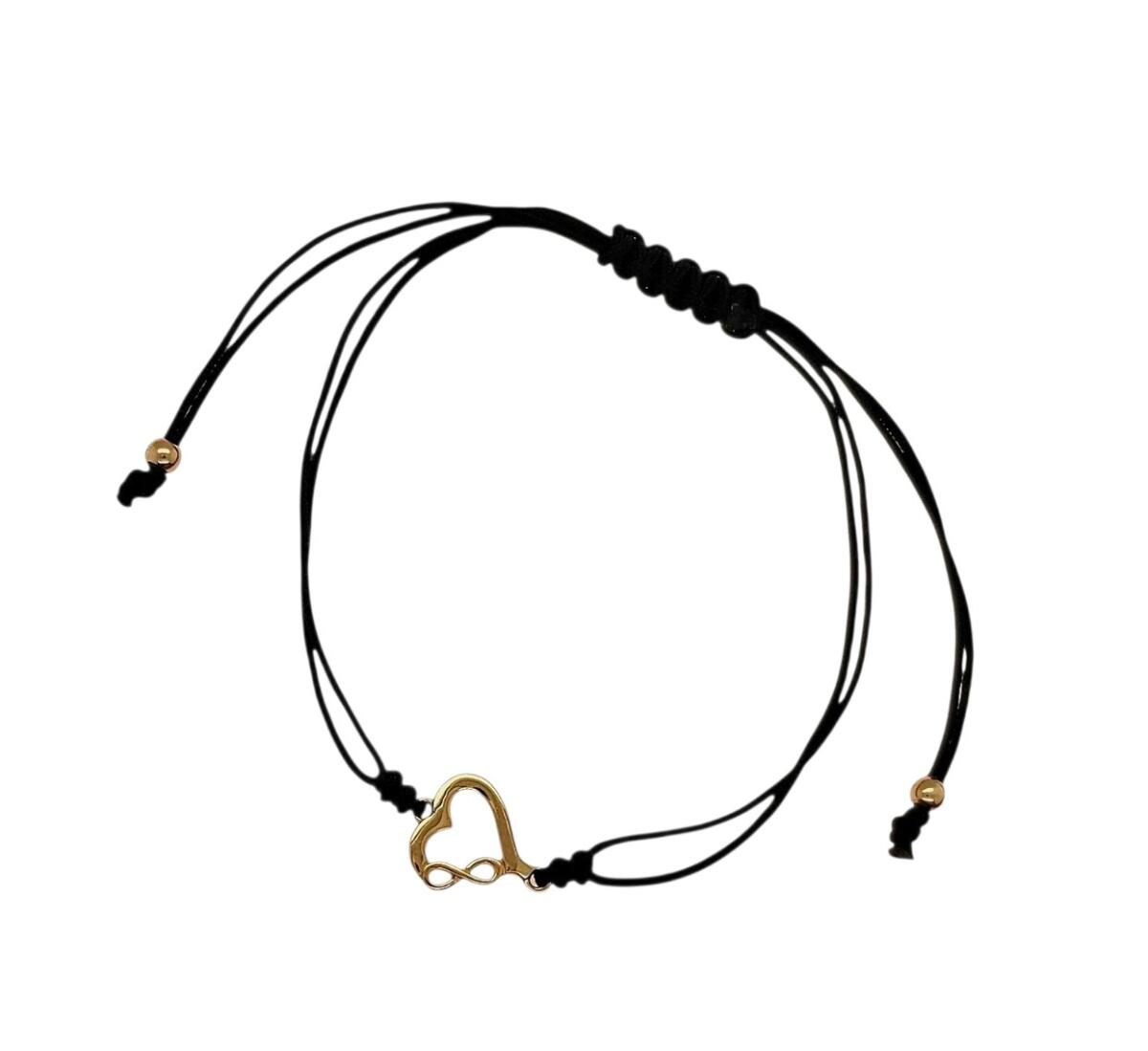 Bransoletka regulowana czarny sznurek, złote, ozdobne elementy: serce, nieskończoność.