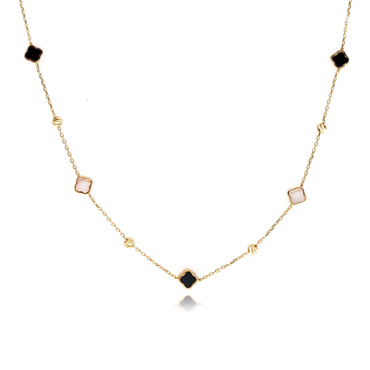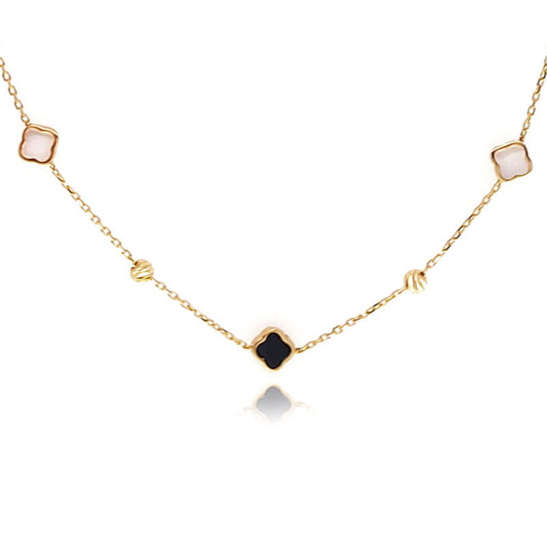 Złoty naszyjnik, zdobiony elementami w formie koniczynek – białych (z masą perłową) i czarnych, a także złotymi diamentowanymi kulami.