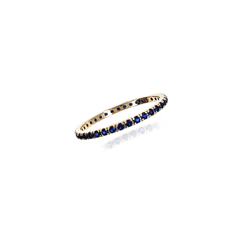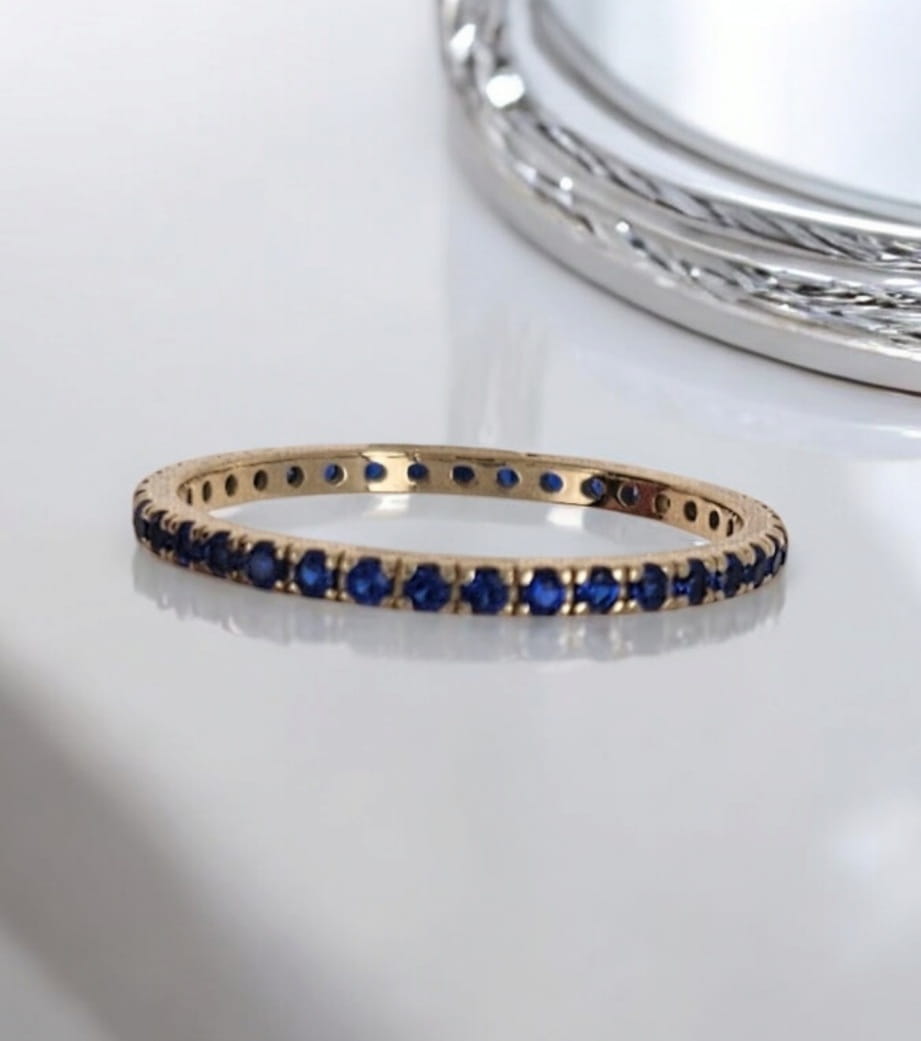 Elegancki złoty pierścionek w ciekawej formie obrączki wysadzanej niebieskimi cyrkoniami.