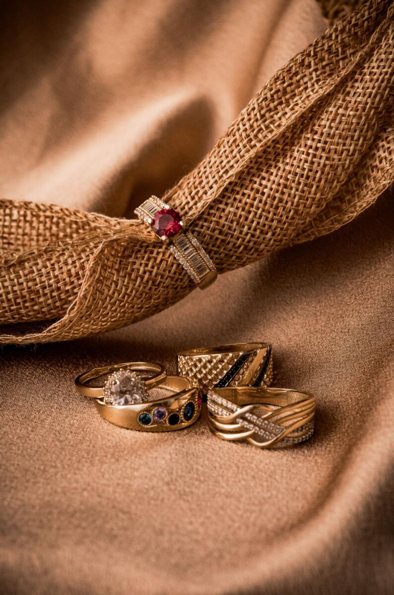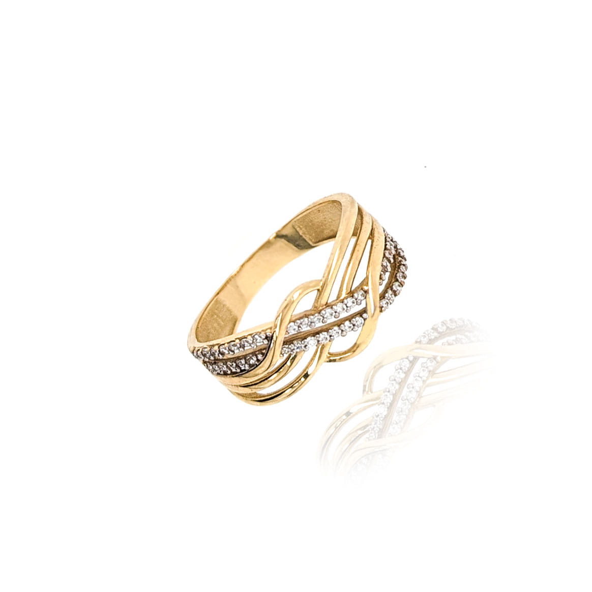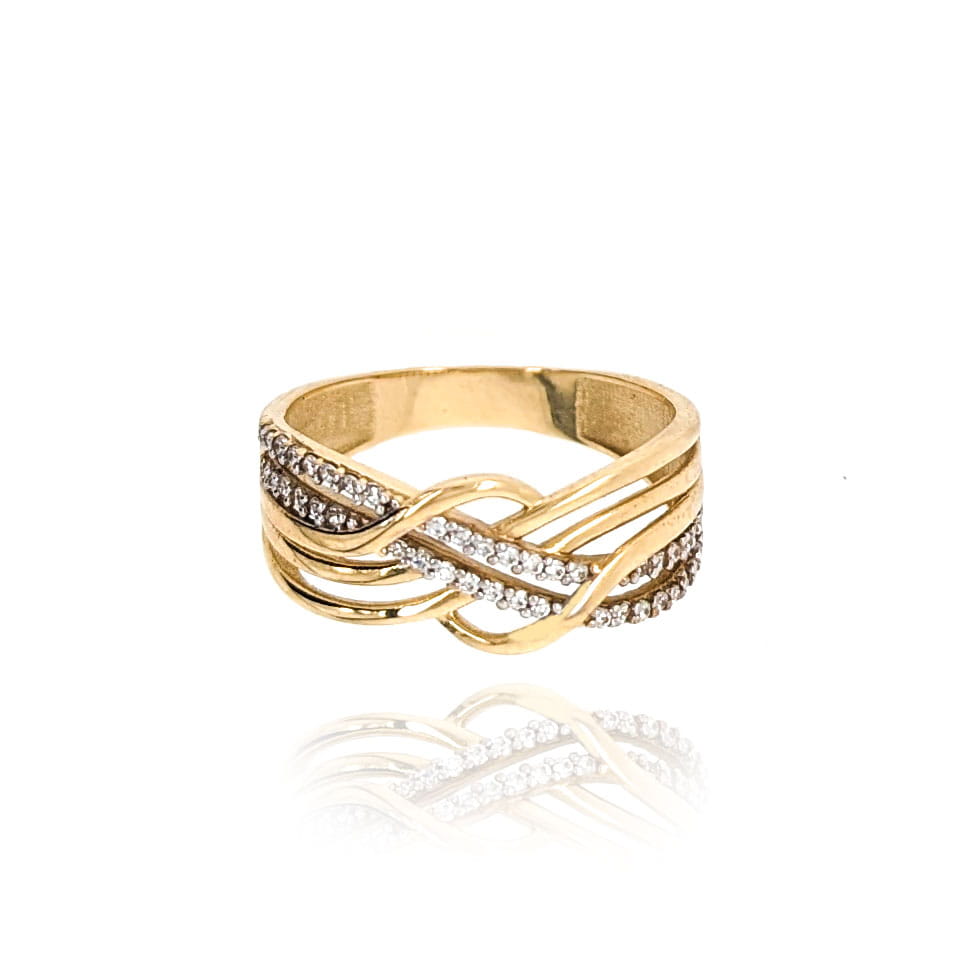 Efektowny, złoty pierścionek – posiadający ciekawy, nowoczesny wzór, przeplatany cyrkoniami.