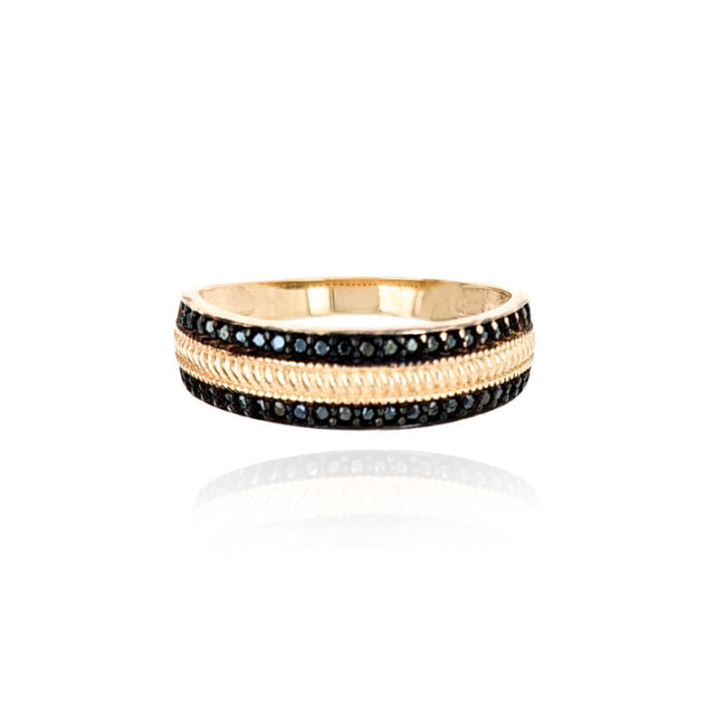 Elegancki złoty pierścionek z czarnymi cyrkoniami. Cyrkonia to dobrze odbijający światło kamień, dzięki niemu pierścionek zyskuje blask.