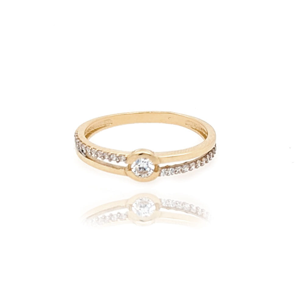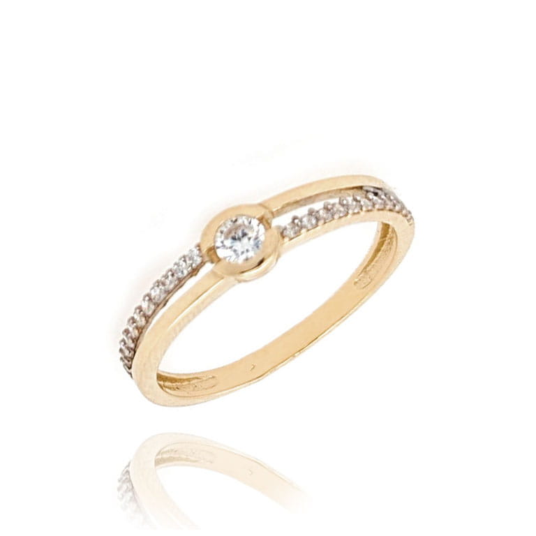 Ponadczasowy, elegancki złoty pierścionek – zdobiony kołem wysadzanym cyrkoniami.