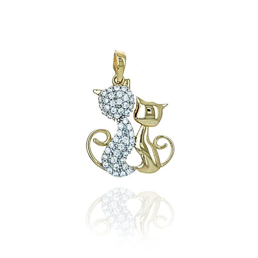 Zawieszka złota z kotami, jeden z nich zdobiony białymi cyrkoniami, które dodadzą uroku i blasku.